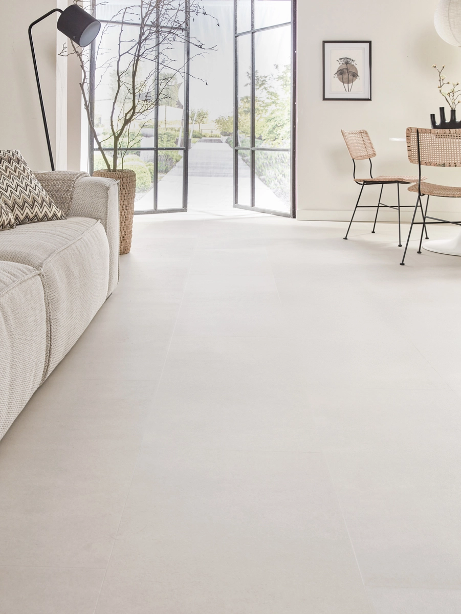 De Floer Tegel PVC – Betonlook Zand combineert de tijdloze uitstraling van beton met het gemak van PVC. Dankzij de unieke MEGAMAT afwerking en de zandkleurige tint voegt deze tegel PVC vloer een zachte, moderne sfeer toe aan je interieur. Met de voelbare structuur en royale afmetingen van 91,4 x 45,7 cm oogt hij als een authentieke betontegel, maar biedt hij alle voordelen van PVC.