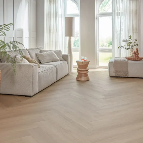 Ga voor rust en luxe met de Zwaardvis Zand vloer uit de exclusieve Walvisgraat PVC collectie. Deze extra grote visgraatvloer brengt een serene sfeer in ieder interieur dankzij het stijlvolle XL visgraatmotief. Dankzij de royale afmetingen en de zachte eiken kleur voegt deze vloer stijl en warmte toe aan ieder interieur. De MEGAMAT afwerking versterkt dat effect en zorgt voor een matte, luxe uitstraling – perfect passend in zowel moderne als klassieke woonstijlen. Zo heeft deze XL visgraat PVC vloer de look van écht eikenhout, maar dan met alle voordelen van PVC.